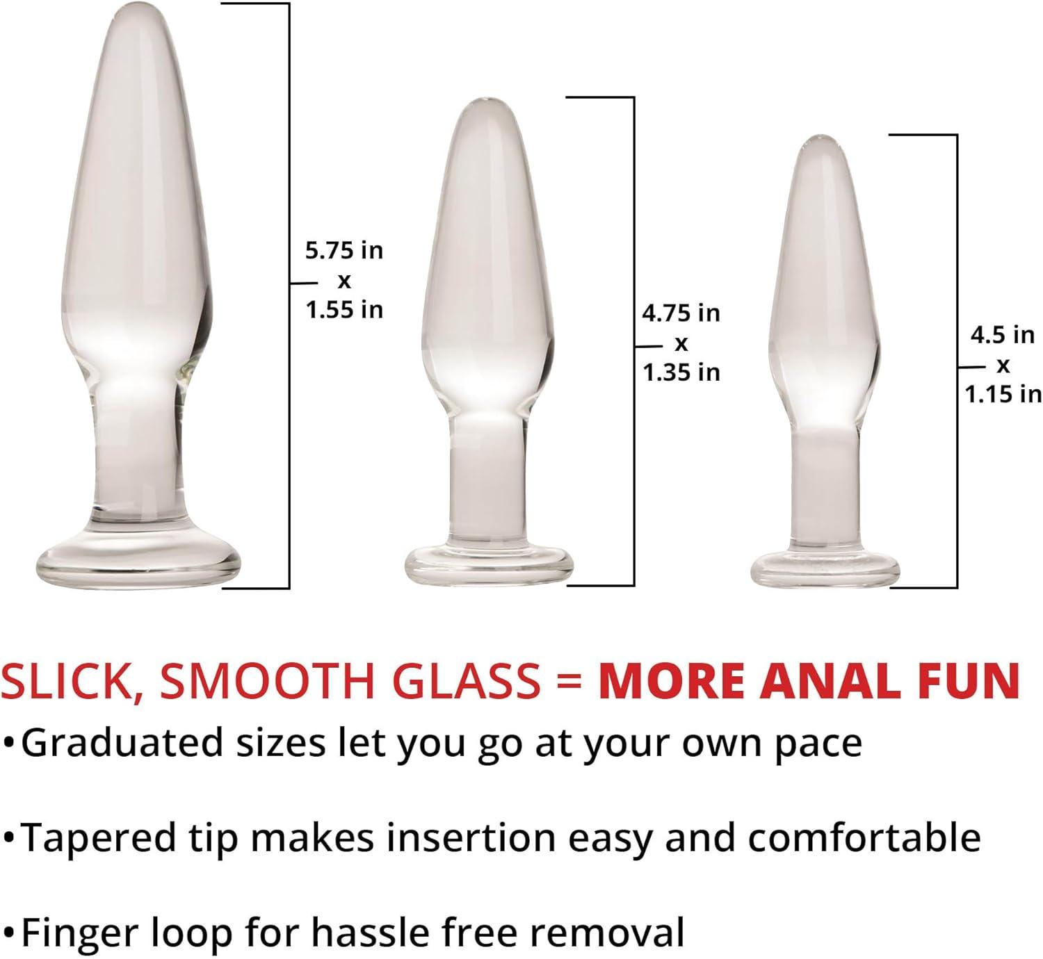 Adam and Eve Glass Anal Plug Set of 3, Hypoallergenic Non Porous Butt Plugs, Smooth Tempered Borosilicate Glass for Backdoor Training and Temperature Play, Small Medium Large Sizes for Women and Men