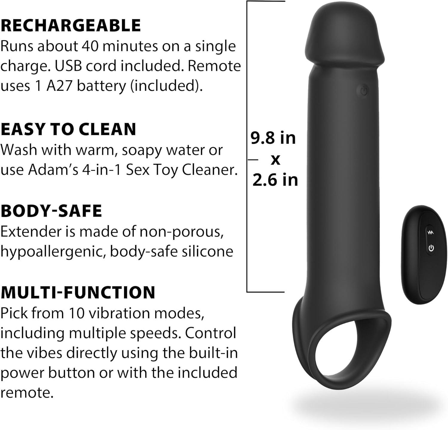 RECHARGEABLE, WATERPROOF, AND BODY-SAFE SILICONE: Made from smooth, hypoallergenic silicone, this vibrating penis extension is USB rechargeable for up to 40 minutes of play. Waterproof for easy cleaning, it pairs best with water-based lubricants for optimal performance