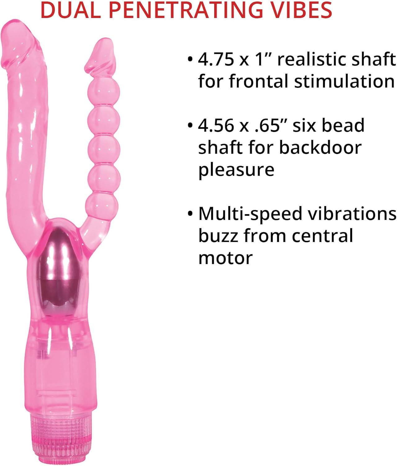 DOUBLE THE PLEASURE: Experience mind-blowing dual stimulation with this double penetration vibrator. The realistic 4.75-inch shaft delivers deep vaginal pleasure, while the 4.5-inch string of firm anal beads teases your backdoor hot spots. Designed for ultimate satisfaction, it's the perfect toy for DP exploration.