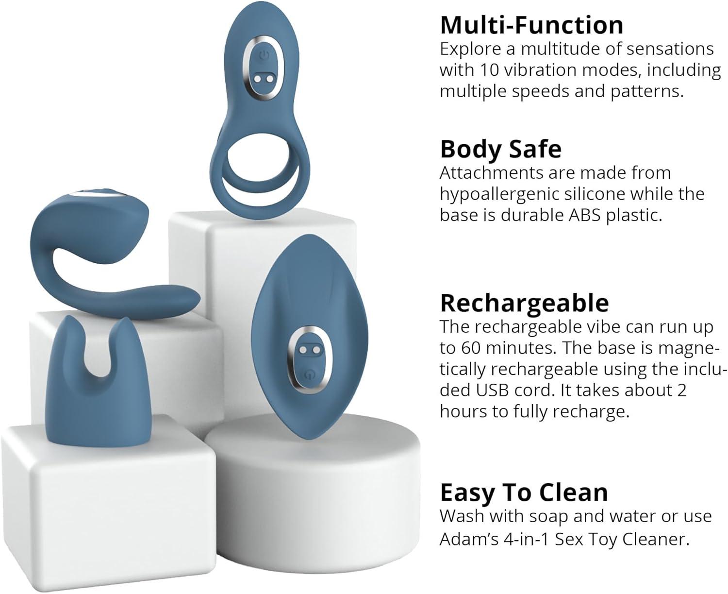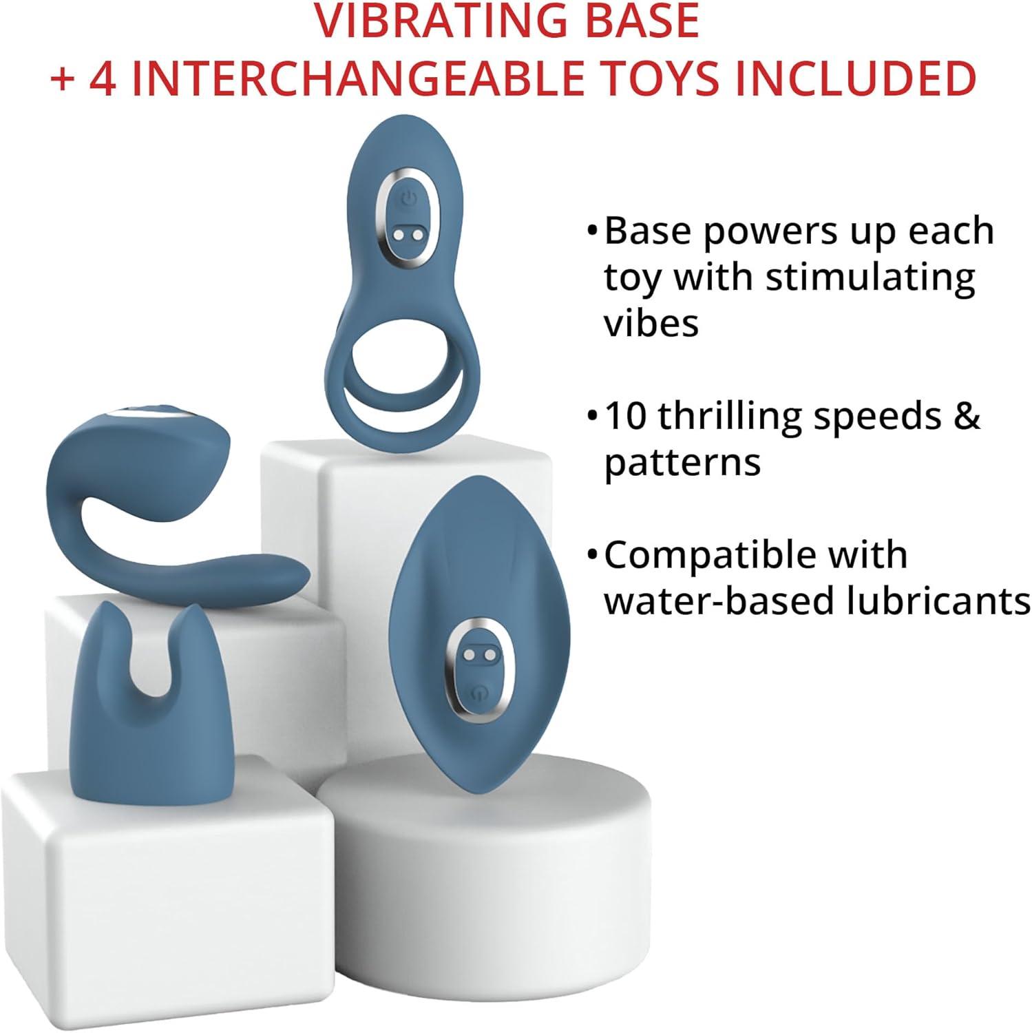 5 PIECE COUPLES VIBRATOR SET FOR ENDLESS FUN: The Adam & Eve Four-Play Vibrator Set includes a rechargeable vibrating base and four interchangeable toys. Perfect for solo or shared pleasure, this set delivers powerful vibrations to enhance your intimate experiences