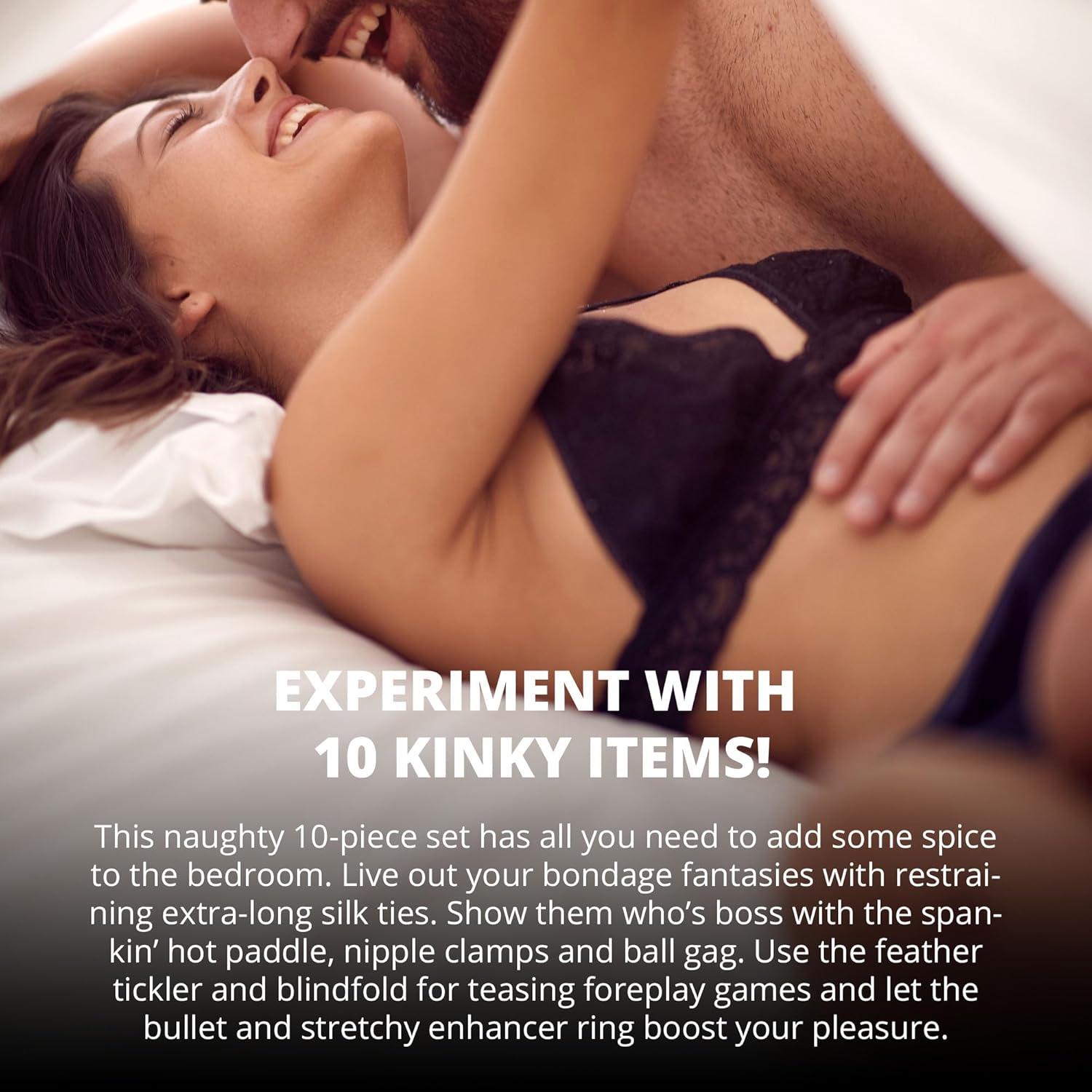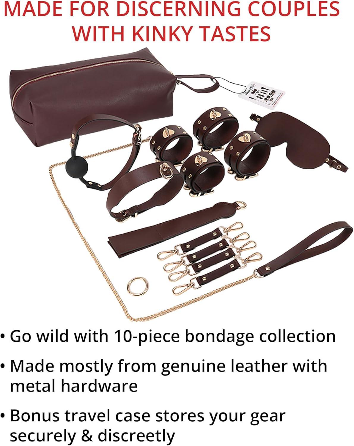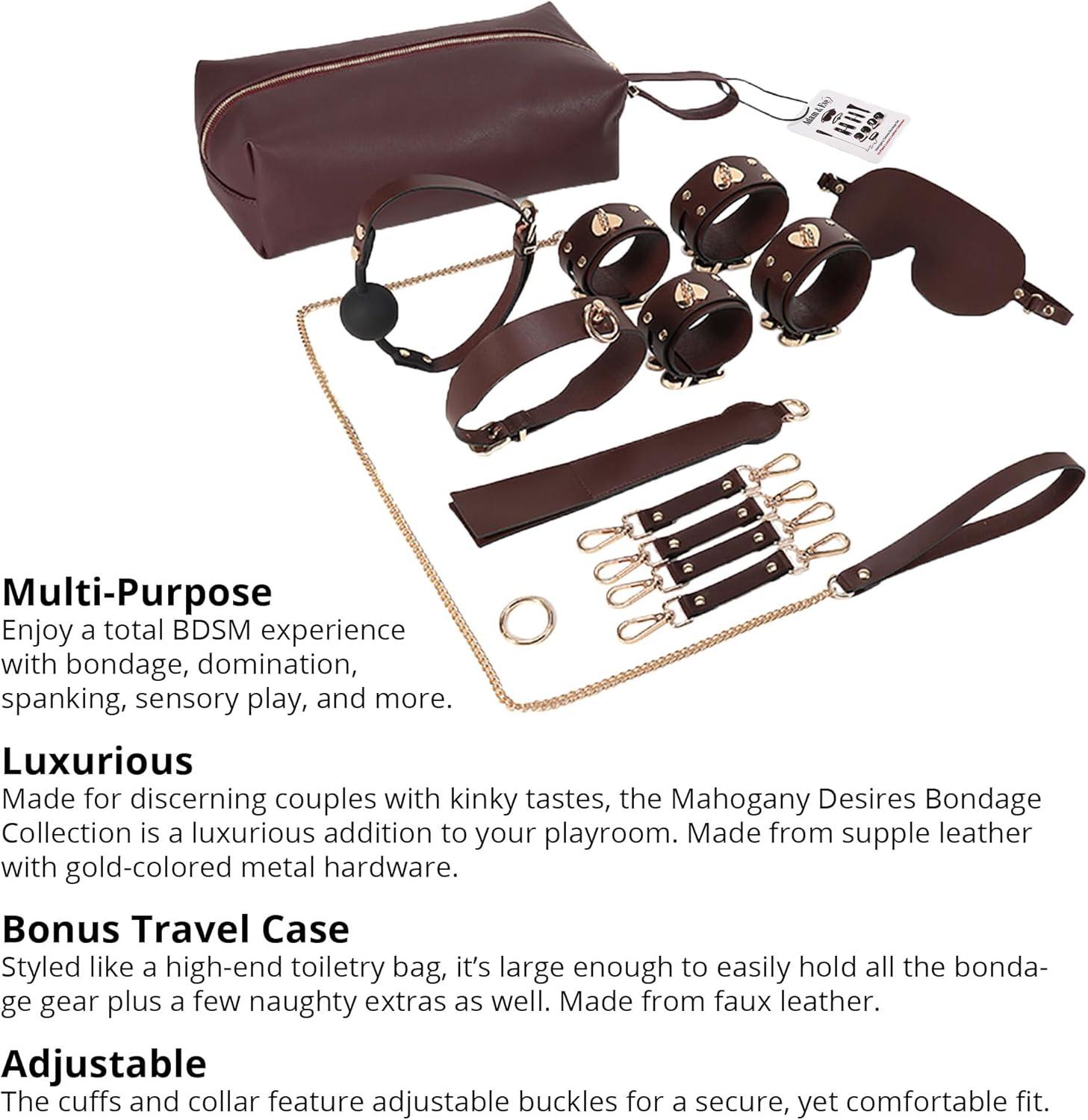 ALL-IN-ONE 10-PIECE BDSM SET: Elevate your kinky play with the Mahogany Desires Bondage Collection, featuring 10 essential BDSM items: leather cuffs, ball gag, blindfold, paddle, collar, leash, hog tie connector, and more. Perfect for beginners and experienced players alike