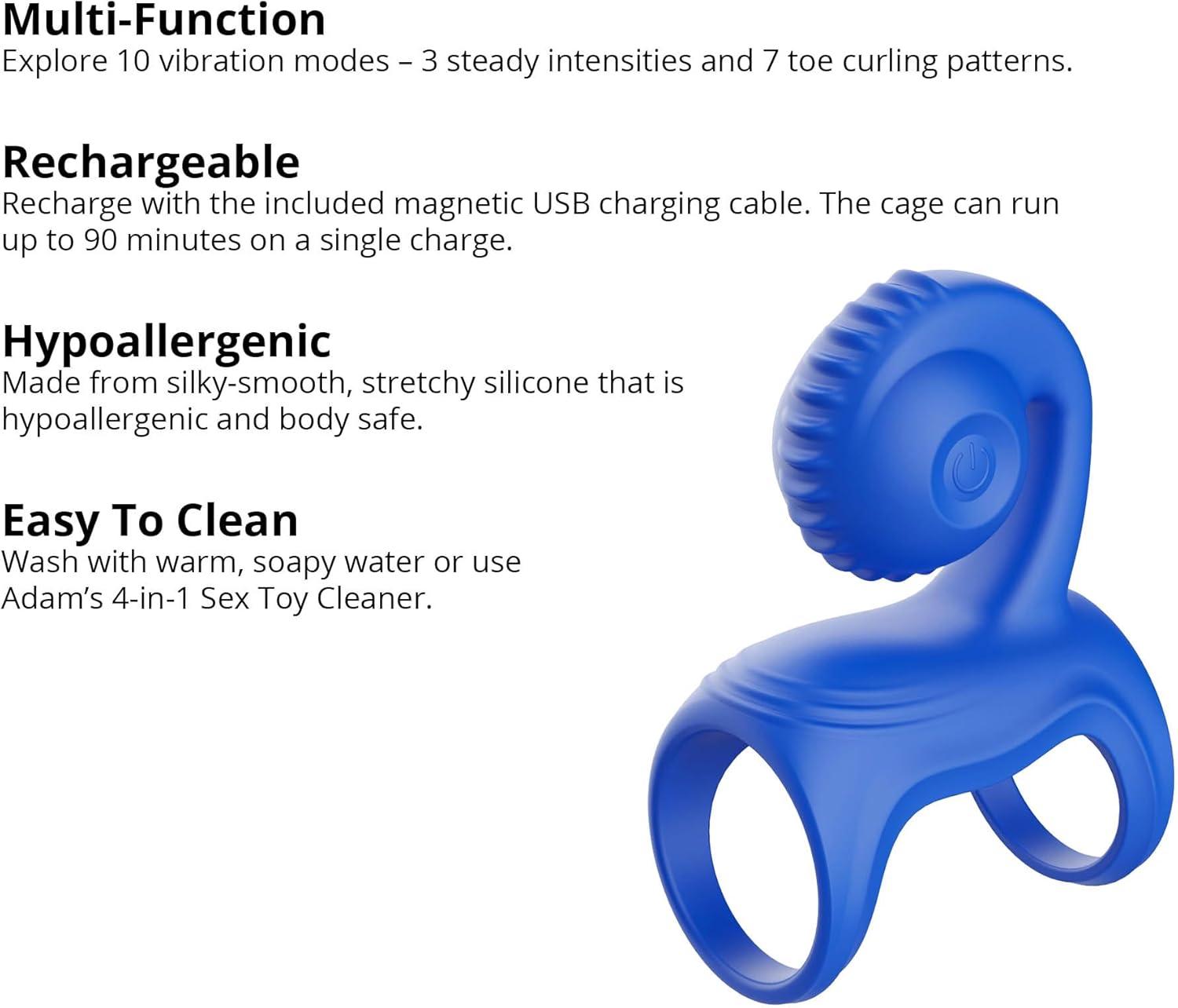 WATERPROOF & RECHARGEABLE: Designed for convenience and versatility, this waterproof vibrating cage is perfect for the shower, bath, or bedroom. Crafted from smooth, body-safe silicone, it stretches to fit comfortably. Rechargeable via magnetic USB cable, it delivers up to 90 minutes of playtime after a full 120-minute charge.