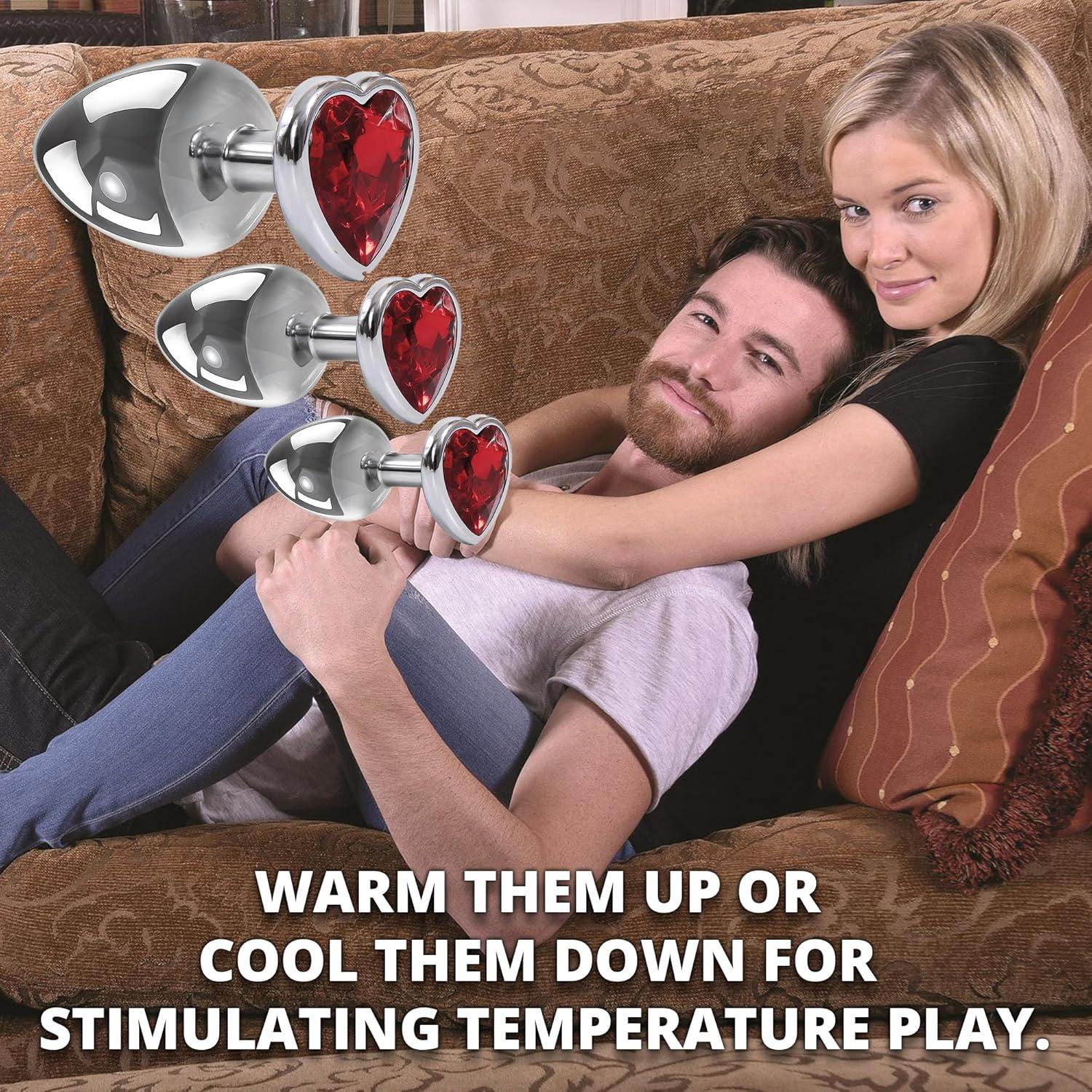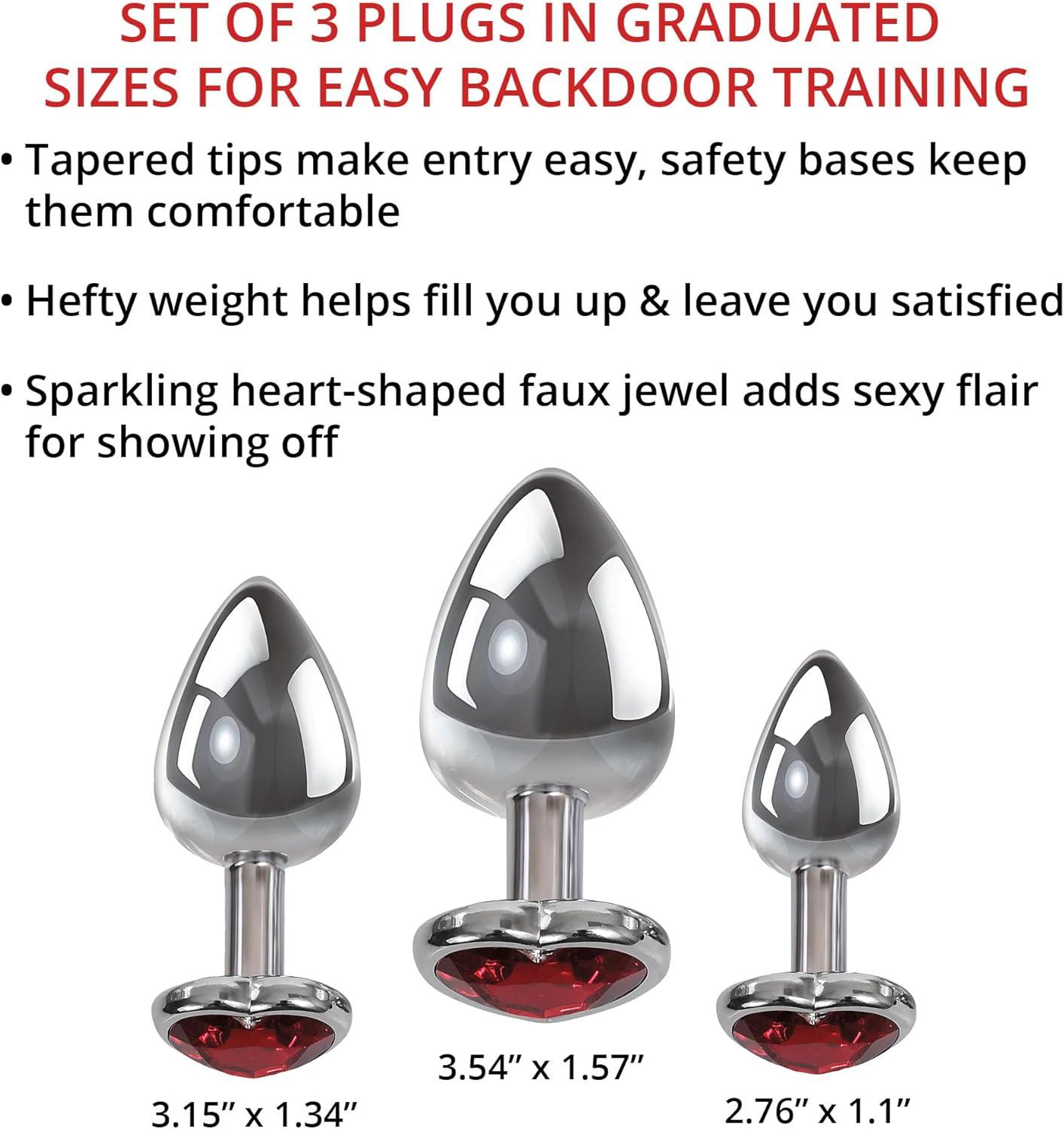 our backdoor deserves some love! With the Three Hearts Gem Anal Plug Set, you’re ready for any size anal thrill you can dream of. This set of 3 graduated aluminum plugs is crafted to give you just the right amount of stimulation. And each plug’s sparkly red heart jewel adds a flirty touch that begs you to show it off. Just add a little of your favorite lubricant to your choice of plug. Beginners will want to start with the Small plug. Lube the entire plug and gently insert the tapered tip. (Hint: if that’s a little too much, try warming up with a finger first.) Tease yourself or take it all in. The slim neck and safety base keep it in place while you show off an amazing rear view – all thanks to that naughty sparkly jewel! Want more? Then it’s time to graduate to the Medium or Large plug sizes. Each steps up the length and width of the plug for a whole new level of challenge and satisfaction. When you’re an anal expert, you may find that you like working your way from Small to Medium to Large all in one session!